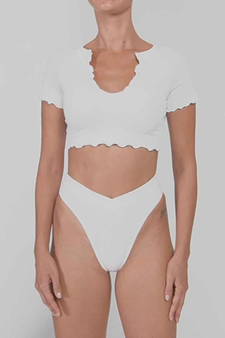 I bought these to go with my santa cruz top and they are the perfect bottom. so flattering, they sit so nicely and the high cut makes my legs look so long